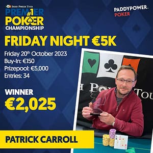 The NLH 5K was eventually won by Patrick Carroll in a tough final table that included; Paul Carr (Team Pro) Brendan Coone , Sam Zheng and Gerard McNeill.