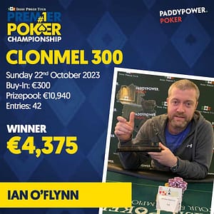 The Clonmel 300 (€10,940 prize pool) was won by Ian O’Flynn for €4,375. His A-10 was plenty to get him over the line besting 41 other entrants.