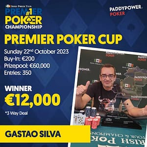 Gastao Silva eventually took home the Premier Poker Cup and an incredible €12,000 after a 3-way deal. He outlasted 349 other entrants in the Clonmel showpiece which had a 60k Prizepool.