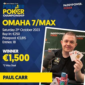 Then our attention turned to Saturday and the Omaha 7 Max. It is important to note here that a few months ago I commented on social media that Darren Harbinson was possibly the best player in the country this year. Paul Carr then symbolically said “Hold my Locozade” (Paul doesn’t drink alcohol) and went out and won the Omaha 7-Max for €1500 and pulled ahead in the league rankings adding valuable points to his tally.