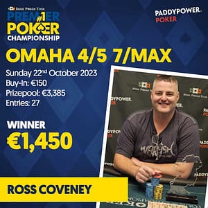 Omaha 4/5 7 Max – Ross Coveney took this title for a score of €1,450. With the prize pool at over €3k, Ross blasted through a 27-runner field to bring home the title.