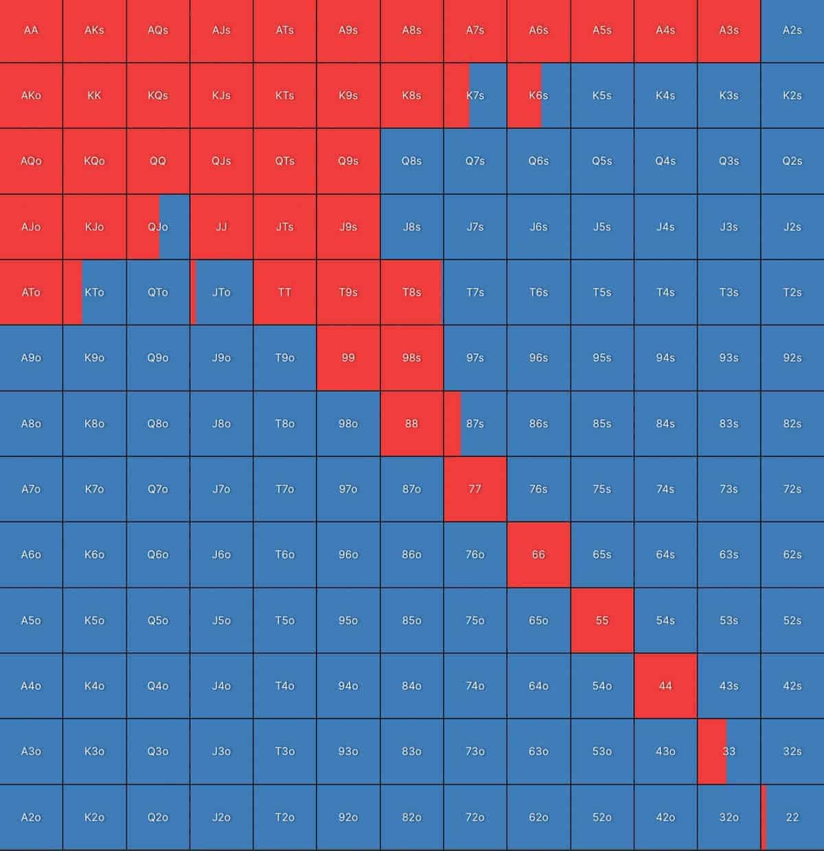 As you probably remember from the continuation betting series, in all these grid diagrams, red means raise, green means call, blue means fold. If the square for a hand mixes more than one colour, it means that more than one action is optimal for that hand. Strictly speaking, to be playing perfectly optimally we should be doing each action more than once when a hand is a mix like this. So for example, with aces you should always raise, with A2s always call, while with KJo you should sometimes raise sometimes call. And with A3o sometimes call sometimes fold.
