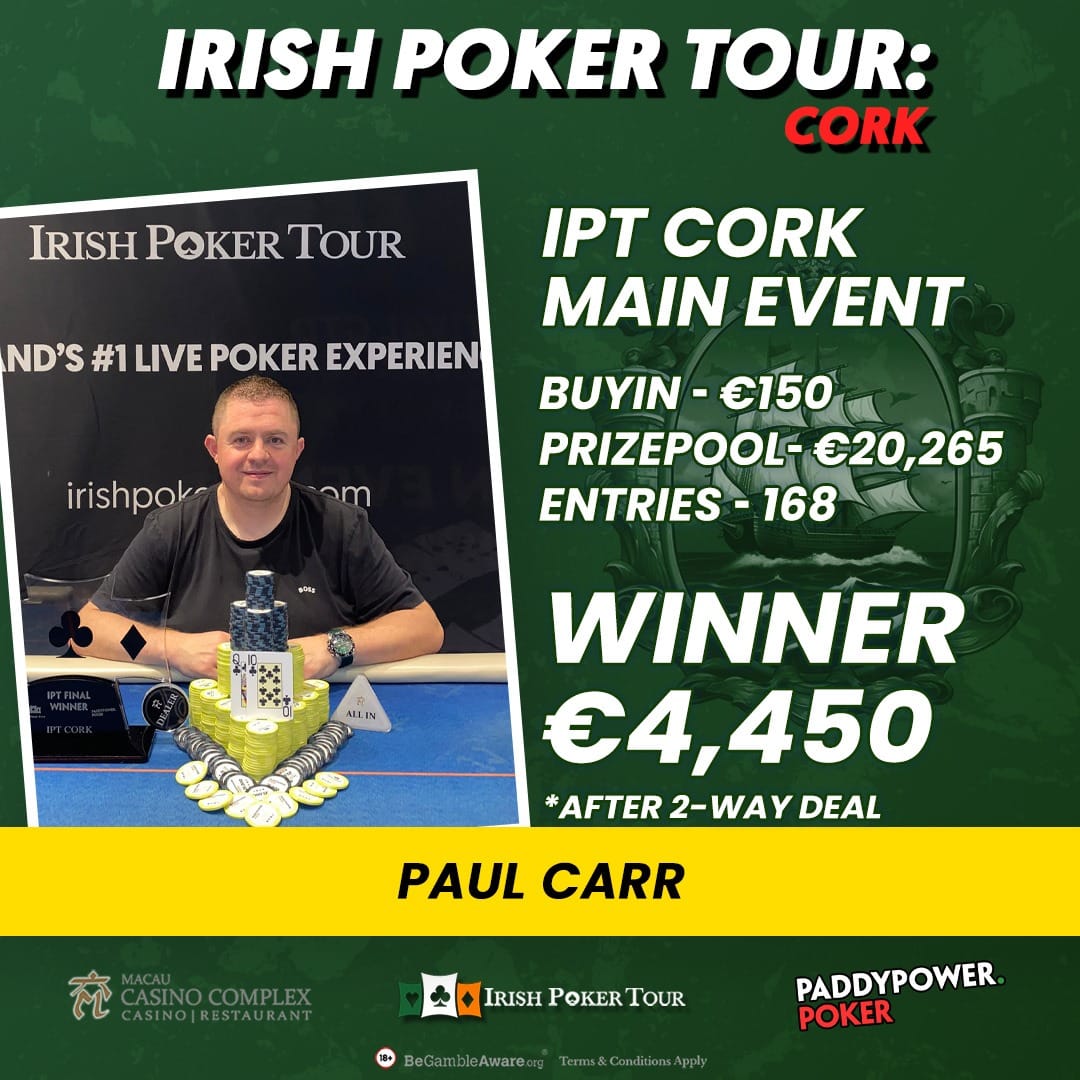 Irish Poker Tour/Paddy Power Poker Leaderboard 2023 Champion, Paul Carr has given himself an outside chance of retaining his title by taking the Cork IPT stop after a deal with James Hoda. Both men took home €4,450 but Paul had the chip lead giving him first place and the trophy. Jamie Wynne was mildly disappointed with €2,400 in third as he had held a strong chip led at various points during the Final Table.