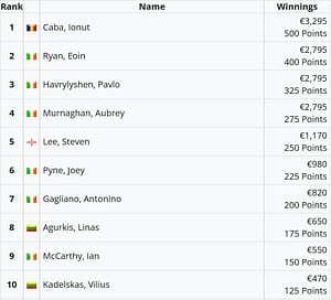 When we kicked off our Live LPU coverage today at our 4th installment of the Siege , our first guarantee was already most of the way there. And in level 5 of the Cotton Club €10k, it was confirmed. €18,768 was the prizepool and Damien Ionut Keb saw off Eoin Ryan heads up after a deal was done 4-way. They played on for an extra €500 and the trophy.
